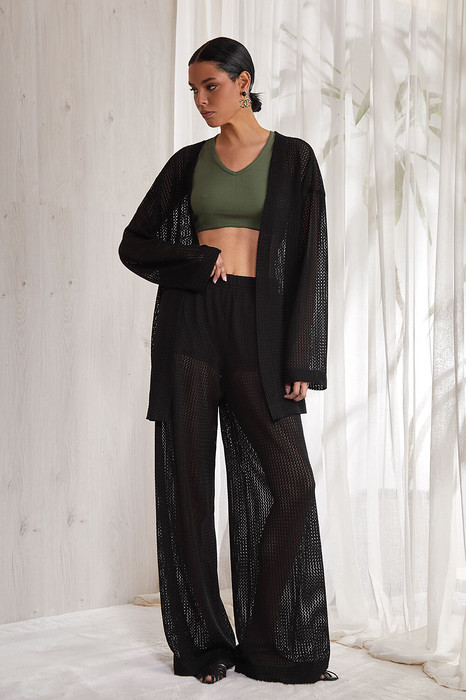 Костюм, состоящий из брюк и кардигана. Кардиган прямого силуэта, длиной до бедер. Изделие без застежки и без воротника. Спущенная линия плеча. Свободный длинный рукав, немного расширенный книзу. Спинка прямая. Изделие без подкладки. Пояс идет в комлекте. Брюки прямые, свободного кроя. Брюки на резинке (без застежки). Карманы в боковых швах .В брюках есть подкладка в виде коротких шортиков.