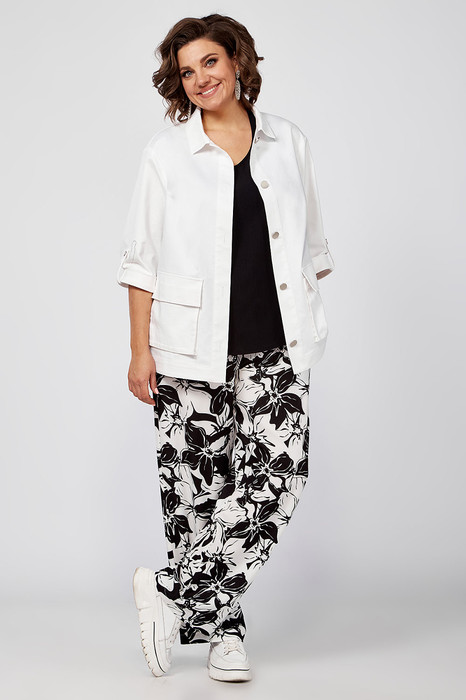 Стильный, современный, трендовый комплект с брюками для повседневной носки, торжественного мероприятия, в офис, школу или на прогулку. Приобретая один комплект, Вы покупаете несколько образов, каждая единица которого универсальна, поэтому может сочетаться со многими вещами из Вашего гардероба. Стильный вариант для красивого женского образа – сочетание белого джинсового жакета с брюками "бананами" из принтованной ткани и контрастной майкой. Жакет-куртка прямого кроя с рельефными швами и кокетками по переду и спинке, накладные карманы с клапанами и декоративные металлизированные пуговицы - узнаваемые нотки вневременной джинсовой мелодии. В рукавах предусмотрены паты с пуговицей, что позволяет сделать рукава короче. Жакет просто необходим при создании как романтического, так и спортивного образа. Майка с рукавом «крылышко», горловина углубленная V-образной формы. Брюки "бананы" с боковыми карманами и поясом частично на резинке. Не упустите возможность приобрести брючный комплект с большим выбором размеров и ощутить комфорт в носке качественной и стильной одежды!