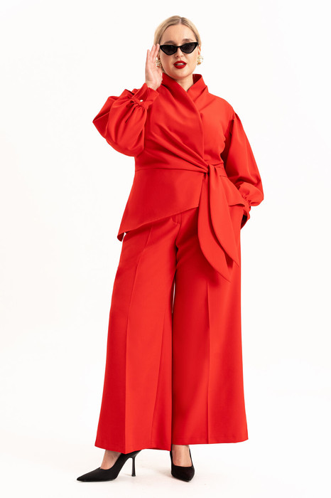Элегантный женский костюм из ткани «марчано» стильный и универсальный наряд для различных мероприятий. Модель "двойка" сочетает в себе современные тенденции 2025-26 года с классическими акцентами. Подходит как для офиса, так и для особых случаев ( новый год, корпоративы, свадьбы или дни рождения) обеспечивая комфорт и уверенность в себе. Брюки с широкими штанинами палаццо выгодно подчеркивают женственные формы, а свободный крой обеспечивает удобство в любой ситуации. Этот костюм больших размеров идеально подойдет для прохладного времени года благодаря легкому материалу и возможности сохранить тепло. Текстура ткани добавляет изысканности и роскоши, делая образ особенно привлекательным на особых событиях. Благодаря универсальному дизайну, костюм можно успешно сочетать с различными элементами гардероба, создавая разнообразные стили от официального до повседневного. На брюках обработаны карманы в боковых швах, по талии пояс с застежкой на молнию и частично на резинке. Жакет с отрезной баской и воротником стойкой переходящей в борта. Застежка на потайную петлю и пуговицу и на завязки. Рукав длинный, втачной на манжете. По окату рукава обработаны складки. Доступен в различных размерах, в том числе и для женщин пышных форм, этот костюм позволит каждой леди подобрать идеальный вариант. Красный цвет костюма подчеркнут вашу индивидуальность и хороший вкус. Независимо от того, выберите ли вы его для офиса или вечера, этот костюм станет верным спутником в создании вашего стильного образа.