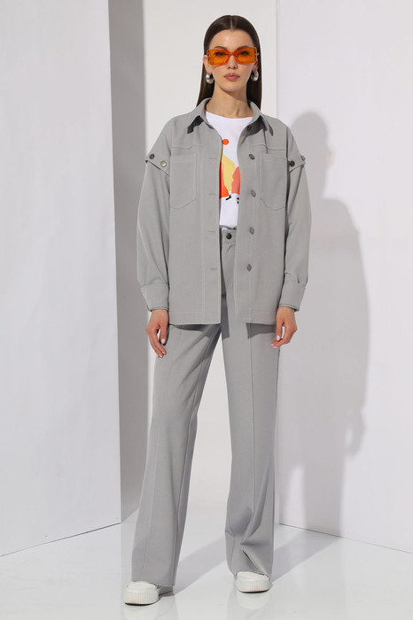 Жакет с застежкой на планку со слегка смещенными пуговицами. Рукава съемные, пристегивающиеся с помощью пуговиц. Низ рукавов обработан манжетами на две пуговицы. На спинке – средний шов и горизонтальная кокетка. На переде – горизонтальная кокетка и накладные карманы. Низ изделия закругленной формы. Горловина оформлена стояче-отложным воротником с отрезной стойкой.