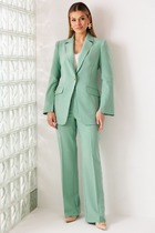 Комплект трехпрехпредметный, состоит из блузы, топа (бандо) и брюк. Выполнен из кружевного полотна.