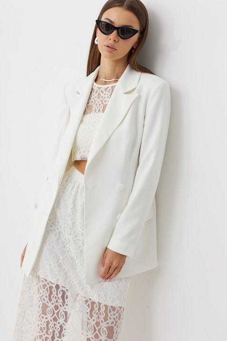 Комплект трехпрехпредметный, состоит из блузы, топа (бандо) и брюк. Выполнен из кружевного полотна.