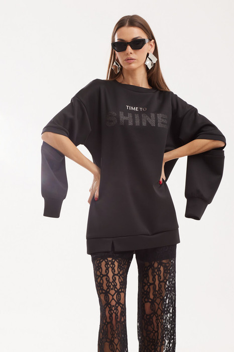 Блузон свободной формы «оверсайз» со спущенным плечом выполнен из трикотажного полотна. Горловина округлой формы обработана планкой. Перед и спинка цельные по низу с планкой и с разрезом по переду. Рукава с планками и с разрезами по линии локтя, по низу – на манжете и слегка присборены. На детали переда расположена печать в цвет брюк.