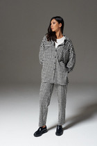 Жакет на подкладке, укорочен. Горловина оформлена воротником пиджачного типа. Рукав двухшовный с вытачной шлицей по низу на три пуговицы. На левой детали переда расположена листочка. Линия плеча расширена. На переде расположены нагрудные вытачки, идущие от низа изделия. Спинка со средним швом и талевыми вытачками.