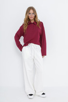 Брюки: слегка расширены к низу от уровня колена. Верхний срез брюк обработан поясом со шлевками. В боковых швах карманы округлой формы. На задних половинках – отрезная кокетка. На передней и задней половине отстроченные стрелки.