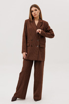 Комплект женский, состоящий из жакета и брюк, с поясом из основной ткани с декоративной пряжкой.