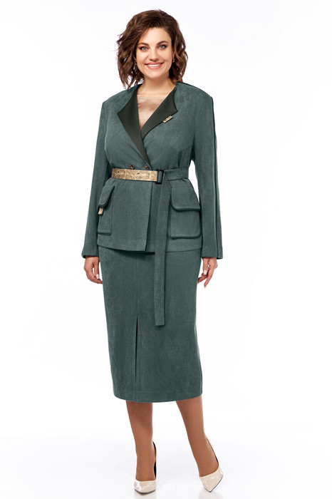 Шикарный костюм тройка из мягкого приятного велюра. Жакет без подкладки, полуприлегающего силуэта, с втачными рукавами, с двубортной застежкой на две петли и пуговицы. Жакет без воротника с отложными лацканами из отделочной ткани. Также отдека используется на рукавах и карманах настрочных на полочке, еще для отделки используется тесьма на клапане, поясе из основной ткани и лацкане. Блузка полуприлегающего силуэта со спущенным рукавом, в боковых швах разрезы. Юбка удлиненная, прямого силуэта. слегка заужена к нзу. По центру спереди разрез, застежка по спинке на пуговицу и тесьму -молнию.