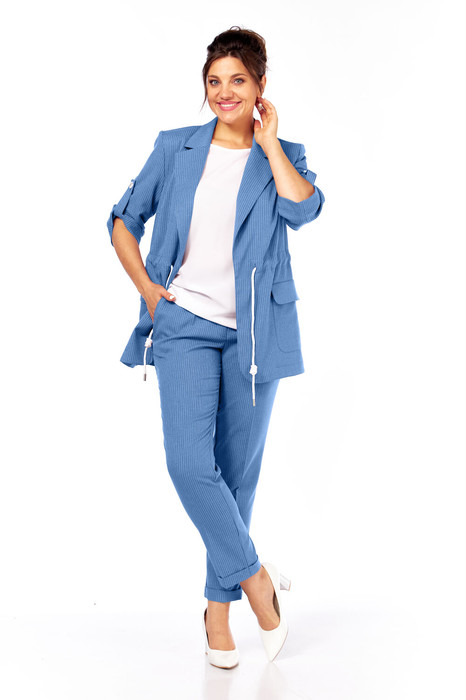 Летний комплект состоящий из жакета, брюк и блузы. Жакет прямого силуэта с пиджачным воротником, без подкладки и без застежки. По бокам накладные карманы с клапанами. На правом клапане декоративная нашивка. По талии кулиска. Рукава втачные, длиной три четверти с патами. Брюки прямые, зауженные к низу, с отворотом, пояс притачной на эластичной тесьме с кулиской, боковые карманы. Блуза прямого силуэта, рукав короткий.