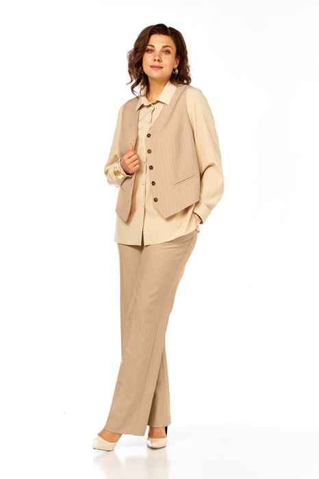 Комплект женский, состоит из блузки, жилета и брюк. Полуприлегающий силуэт, жилет с V-образной формой горловины, на переде рельефы от проймы, имитация карманов в рамку, по спинке хлястик с пуговицей. Блузка с рубашечным воротником и застежкой на петли и пуговицы, нагрудные вытачки, рукав одношовный с манжетой. Разрезы в боковых швах. Брюки прямые, с карманами. Пояс по спинке на резинке. На переде и спинке заутюжены стрелки.