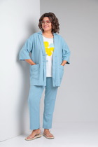 Стильный нарядный костюм из мягкой струящейся ткани. Блуза прямого силуэта с декоративным цветком, пришивным. Спинка со средним швом, в котором потайная молния. Рукав прямой. Разрезы в боковых швах. Брюки прямые с карманами в боковых швах. Пояс на резинке по спинке, по переду молния и петля и пуговица.