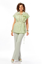 Костюм полуприлегающего силуэта. Элегантный костюм с интересным кроем не оставит Вас равнодушной. Жакет на подкладке с воротником пиджачного типа. Срез борта фигурной формы. По переду рельефы, между которыми декоративный элемент в виде шнуровки. Прорезные карманы в рамку, спинка со средним швом и рельефами. Рукав длинный двухшовный. Брюки слегка расклешенные, на поясе, с застежкой на молнию и петлю и пуговицу. По спинке пояс на резинке. Заутюженные канты по передним и задним полотнищам. Карманы к боковым швам.