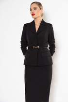 Элегантный офисный костюм послужит вам для создания стильных образов. Его уместно надеть на работу, учебу, деловую встречу, конференцию, бизнес-ланч. Модель изготовлена из плотной поливискозной ткани. Укороченный жакет и юбка-карандаш длиной ниже колена скроены в прямом силуэте, отлично садятся по фигуре. Пиджак с английским воротником и нагрудным карманом подчеркивает официальный стиль комплекта. Юбка с молнией в гульфике дополнена карманами-обманками.