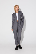 Текстильный костюм-двойка из свободного жакета и укороченных брюк с резинкой по поясу. Детали: жакет прямого силуэта, пиджачный воротник, перед с прорезными функциональными карманами, нагрудный декоративный карман, однобортная застежка на петли и пуговицы, спинка со средним швом, рукава втачные двухшовные с разрезами по низу, жакет на подкладке. Брюки с высокой посадкой, притачной пояс со шлевками, задняя часть пояса эластичная- с резинкой, застежка на молнию и пуговицу, боковые карманы, передние половины с двумя складками.