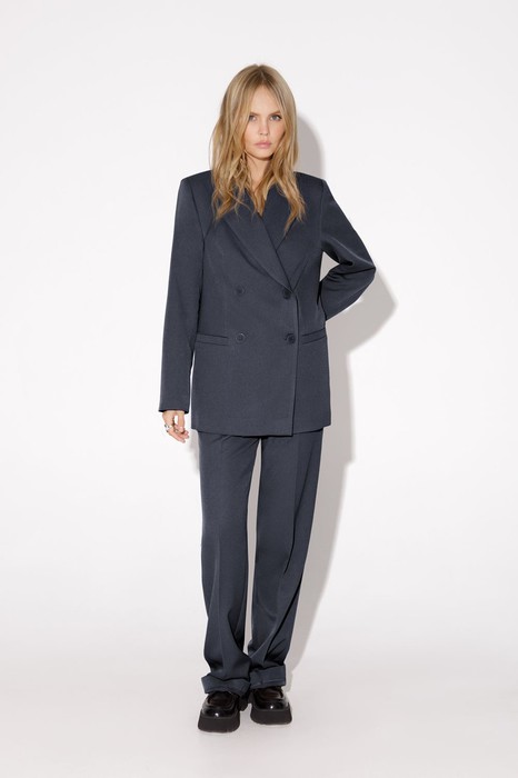 Текстильный костюм-двойка из двубортного оверсайз жакета и прямых брюк с высокой посадкой. Детали: жакет прямого силуэта, пиджачный воротник, прорезные карманы, спинка со средним швом, втачные двухшовные рукава, жакет на подкладке. Брюки на притачном поясе со шлевками, передние половины с небольшими мягкими складками и заутюженными стрелками, застежка на молнию и пуговицу, боковые карманы.