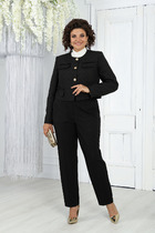Текстильный костюм-двойка из двубортного полуприлегающего жакета и прямых брюк со стрелками. Детали: жакет с отрезными бочками и нагрудными вытачками, пиджачный воротник, прорезные карманы, застежка на петли и пуговицы, спинка со средним швом, втачные двухшовные рукава, жакет на подкладке. Брюки с высокой посадкой на притачном поясе со шлевками, передние половины с небольшими застроченными мягкими складками и заутюженными стрелками, застежка на молнию и пуговицу, боковые карманы.