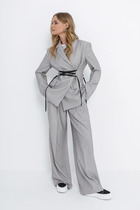 Текстильный костюм-двойка из укороченного приталенного жакета со складками и широких прямых брюк со стрелками.