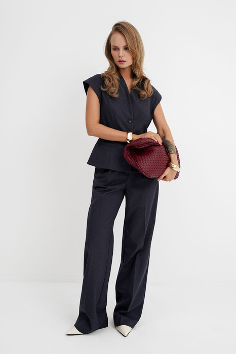 Костюм-двойка из приталенного жилета с воротником-стойкой и широких прямых брюк из текстильной ткани с рисунком «ёлочка».