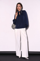 Текстильный костюм-двойка из оверсайз жакета с разрезами по рукавам и широких брюк-палаццо.