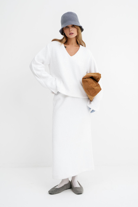 Костюм-двойка из свободного джемпера и прямой миди-юбки из пушистой ткани.