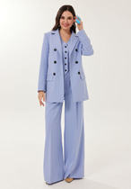 Детали: жакет прямого силуэта, расширенная линия плеч, талиевые вытачки, круглая горловина, без воротника, рукава втачные со шлицами, имитация карманов, застежка на петли и декоративные пуговицы, на подкладке. Широкие брюки-палаццо с небольшими складками у пояса и заутюженными стрелками, притачной пояс со шлевками, застежка на молнию и пуговицу, боковые карманы. Задние части брюк с вытачками и имитацией карманов.