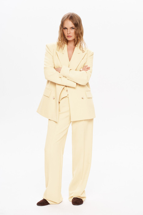 Детали: жакет свободного покроя и полуприлегающего силуэта, двубортная застежка на петли и пуговицы, отрезные бочки, пиджачный воротник, функциональные карманы, жакет на подкладке. Жилет полуприлегающего силуэта, талиевые вытачки, застежка на петли и пуговицы, функциональные карманы, фигурный низ, на подкладке. Брюки с высокой посадкой, притачной пояс со шлевками, передние половины с небольшими застроченными мягкими складками и заутюженными стрелками, застежка на молнию и пуговицу, боковые карманы. Задние части брюк с вытачками и заутюженными стрелками. Пояс брюк прямой, без резинки.