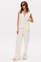 Детали: поло прямого силуэта, свободный покрой, спущенная линия плеча, потайная застежка на петли и пуговицы, длинные рукава. Широкие брюки-палаццо с небольшими складками у пояса и заутюженными стрелками, притачной пояс со шлевками, застежка на молнию и пуговицу, боковые карманы. Задние части брюк с вытачками и имитацией карманов.
