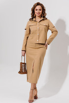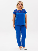 Длина жакета по спинке около 69 см в размерах 40-46 и около 72 см в размерах 48-52, длина рукавов около 62 см. Длина брюк по боковому шву с поясом около 113 см в размерах 40-46 и около 114,5 см в размерах 48-52, длина по внутреннему шву около 82 см.