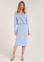 Длина жакета по спинке около 69 см в размерах 40-46 и около 72 см в размерах 48-52, длина рукавов около 62 см. Длина топа по спинке около 27,5 см в размерах 40-46 и около 29 см в размерах 48-52. Длина брюк по боковому шву с поясом около 113 см в размерах 40-46 и около 114,5 см в размерах 48-52, длина по внутреннему шву около 82 см