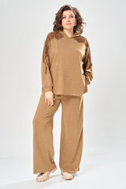 Детали: прилегающий силуэт, воротник с застежкой-поло, втачные длинные рукава расширенные к низу. Юбка прямого силуэта, пояс на резинке, спинка с высоким разрезом. Юбка на трикотажной подкладке.