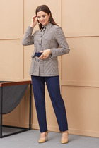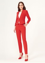 Текстильный костюм-двойка из приталенного жакета фурнитурой под золото и укороченных брюк со стрелками. Детали: пиджачный воротник, нагрудные вытачки, прорезные карманы с фигурными клапанами, рукава втачные со шлицей, съемный пояс, жакет на подкладке; брюки со средней посадкой на притачном поясе, на передних половинах складки и заутюженные стрелки, застежка на молнию и пуговицу, боковые карманы.