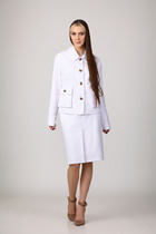 Детали: полуприлегающий силуэт, цельнокроеный воротник-стойка, рельефные швы переда и спинки, функциональные карманы, застежка на петли и пуговицы, жилет на подкладке. Юбка с талиевыми вытачками, застежка на потайную молнию в левом боковом шве, верхняя мини-юбка на подкладке.