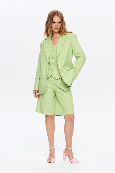 Льняной костюм-тройка из оверсайз жакета, полуприлегающего жилета и шорт-бермуд.