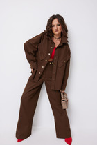 Длина жакета по спинке около 56 см в размерах 40-46 и около 58,5 см в размерах 48-52, длина рукава около 62,5 см. Длина брюк по боковому шву с поясом около 114 см в размерах 40-46 и около 115,5 см в размерах 48-52. Длина по внутреннему шву около 83 см