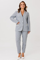 Детали: жакет прямого силуэта, расширенная линия плеч, пиджачный воротник, перед с функциональными карманами, однобортная застежка на петли и пуговицы, спинка со средним швом и шлицей, рукава втачные двухшовные, жакет на подкладке. Жилет прямого силуэта и талиевыми вытачками, застежка на петли и пуговицы, функциональные карманы, на подкладке. Юбка на притачном поясе, застежка сзади на потайную молнию, юбка на подкладке.
