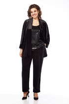 Детали: жакет прямого силуэта, расширенная линия плеч, пиджачный воротник, перед с функциональными карманами, однобортная застежка на петли и пуговицы, спинка со средним швом и шлицей, рукава втачные двухшовные, жакет на подкладке. Юбка на притачном поясе, застежка сзади на потайную молнию, юбка на подкладке.