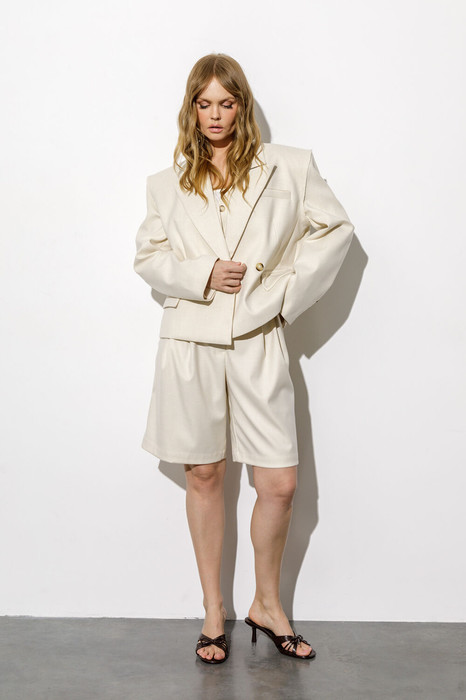 Костюм-двойка из укороченного оверсайз жакета с необработанными проймами и шорт-бермуд с широкими складками.