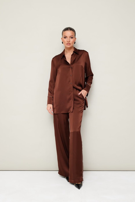 Женский комплект, состоящий из рубашки и брюк, выполнен из струящейся ткани с благородным матовым блеском. Рубашка современного прямого силуэта с центральной застежкой на петли и пуговицы. Горловина с рубашечным воротником на притачной стойке. Рукава со спущенной линией втачивания плеча с притачной манжетой. Брюки прямого силуэта с боковыми наклонными карманами. Пояс притачной на резинке, для регуляции размера. По манжете рубашки и в боковом шве брюк обработан кант.