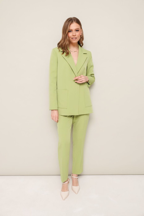 Комплект 2-предметный, состоящий из жакета и брюк, выполненный из костюмной ткани. Жакет прямого силуэта, с центральной застежкой на петлю и пуговицу. Воротник пиджачного типа с отложными лацканами. Спереди обработаны накладные карманы. Рукава втачные, двухшовные.  Жакет на подкладке. Брюки прямого силуэта слегка зауженные к низу, с заутюженными стрелками и с боковыми наклонными карманами. Застежка на пуговицу и тесьму-молнию. Пояс притачной на резинке для регуляции размера. На задних половинках брюк обработаны карманы с листочками.