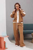Костюм женский из гладкокрашеного трикотажного полотна "кулирка с лайкрой" состоящий из футболки и брюк. Футболка – классического покроя, с короткими втачными рукавами и горловиной овальной формы, обработанной втачной планкой, на полочке выполнен принт в технике "шелкографии".Брюки – длинные, классического кроя, на притачном поясе с эластичной тесьмой внутри и карманами в боковых швах. Передние половины брюк застрочены по центральным линиям. По центру пояса настрочен декоративный элемент.