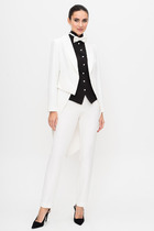 Комплект женский, состоящий из жилетки и брюк. Жилетка прямого силуэта, длиной ниже линии бедер. Спинка с плечевой вытачкой с левой стороны,  с ассиметричной складкой. По переду с правой стороны обработан карман с листочкой.  В области груди на левом переде настрочен клапан с декоративной пряжкой. Воротник пиджачного типа с лацканами. Двубортная застежка по переду на петли и пуговицы. Жилетка на подкладке. Брюки прямого силуэта, на притачном поясе с резинкой по спинке. По задним половинкам талиевые вытачки. По передним половинкам обработаны боковые карманы с наклонным входом, и застежка на тесьму-«молнию» с гульфиком и откоском. По поясу застежка на петлю и пуговицу.