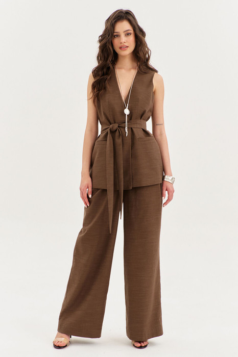 Комплект, состоящий из жилетки и брюк. Жилетка свободного кроя, длиной чуть ниже линии бедер. Спинка со средним швом, в котором обработана шлица. Перед с талиевой вытачкой, переходящей в карман. Карман прорезной с листочкой. Вырез V-образный, без воротника. Жилетка без застежки, на подкладке, с плечевыми накладками. Жилетку дополняет съемный пояс. Брюки палаццо, длинные, на притачном поясе с частично вставленной резинкой. По задним половинкам талиевые вытачки. По передним половинкам заложены односторонние складки, обработаны боковые карманы с наклонным входом. Застежка с гульфиком и откоском на тесьму-«молнию». По поясу вставлены шлевки.