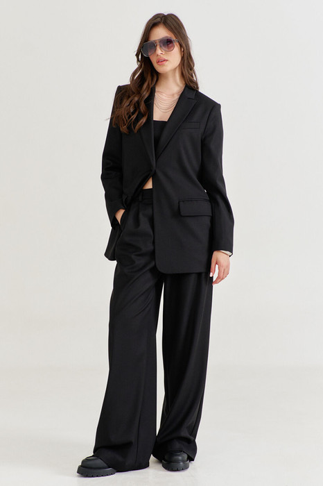 Костюм женский, состоящий из жакета и брюк. Жакет прямого силуэта, длиной ниже линии бедер. Спинка со средним швом, в котором обработана высокая шлица. По переду обработаны карманы «в рамку» с клапаном. В области груди на левом переде обработан карман-обманка с листочкой. Рукава длинные, двушовные, втачные. По низу рукава, в локтевом шве обработана шлица. Воротник пиджачного типа с лацканами. Застежка по переду на петлю и пуговицу. Жакет на подкладке, с плечевыми накладками.