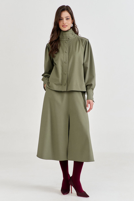 Комплект, состоящий из блузона и юбки. Блузон свободного кроя, длиной выше бедер. По спинке кокетка, переходящая на перед. По шву притачивания кокетки частичная сборка. По переду обработаны прорезные карманы «в рамку». По шву притачивания кокетки выполнена сборка. Рукава одношовные, втачные, длинные. По окату рукава заложены складки. По низу рукава заложены складки, разрез и притачная манжета. Разрез обработан цельнокроеной планкой. По манжете застежка на кнопки. По горловине воротник стойка. По воротнику настрочена пата. Застежка по переду на кнопки на притачной планке. Юбка А-образного силуэта, длиной до середины икры. Заднее полотнище со средним швом, в котором обработана застежка на потайную тесьму-«молнию». Переднее полотнище со средним швом, в котором обработан разрез. Юбка на притачном поясе-обтачке.
