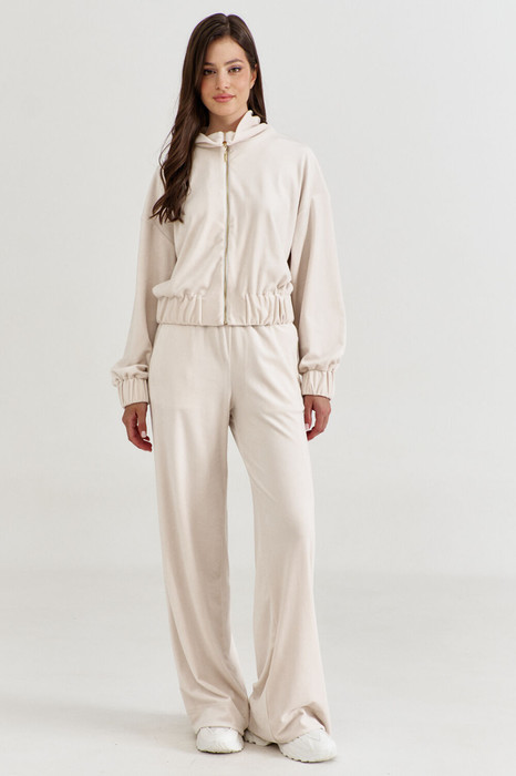Комплект, состоящий из бомбера и брюк. Бомбер, свободного кроя, длиной чуть ниже талии. По переду застежка на декоративную тесьму-«молнию». По горловине воротник стойка. Линия плеча спущена. Рукава длинные, по низу с притачной манжетой, в которую вставлена резинка. По низу бомбера вставлена резинка. Брюки свободного кроя, длинные, на притачном поясе с резинкой. В боковых обработаны карманы с наклонным входом.
