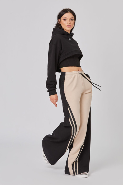 - выполнены из двух видов материала: задняя часть брюк черного цвета из джинса, передняя часть – трикотаж белого цвета
