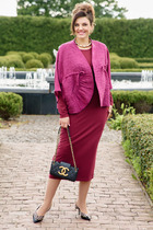 Костюм женский предназначен для повседневной носки. Костюм женский 2-х предметный жакет и юбка. Жакет женский полу прилегающего силуэта, длиной до линии бёдер. Перед с 2-мя талиевыми вытачками, с 2-мя накладными карманами, с 2-мя закруглёнными концами, с 2-мя прямоугольными клапанами, фиксирующиеся к карманам на петли обмётанные и пришивные пуговицы. Спинка со средним швом и 2-мя талиевыми втачками. Горловина круглая, обточная, без воротника. Застёжка центральная бортовая на 5-ть обмётанных петель и 5-ть пришивных пуговиц. Рукав втачной, 2-х шовный, длиной 3/4. Жакет с приточной подкладкой. Жакет с плечевыми накладками. Юбка женская "карандаш" длиной за колено. Переднее полотнище цельнокроеное. Заднее полотнище с 2-мя талиевыми выточками со средним швом, заканчивающимся шлицей. Застёжка на потайную тесьму-молнию В среднем шве заднего полотнища. Юбка с приточным поясом, собранным по бокам на эластичную тесьму с застёжкой на 1-ну обмётанную петлю и 1-ну пришивную пуговицею Юбка на подкладке. Длина спинки жакета 57 см, длина рукава 47 см, длина юбки по боковому срезу 61 см.