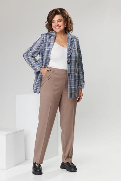 Костюм женский предназначен для повседневной носки. Костюм женский 2-х предметный жакет и брюки. Жакет женский прямого силуэта длиной ниже линии бёдер на 10 см. Перед с 2-мя таллиевыми вытачками, с 2-мя накладными карманами, левый декорирован вставкой из отделочной ткани и надстрочной аппликацией. Спинка со средним швом. Горловина с V-образным вырезом с втачным воротником пиджачного типа с отложным лацканом. Застёжка центральная бортовая, на 2-е обмётанные петли и 2-е пришивные пуговицы. Рукав втачной, 2-х шовный, длинный. Жакет с плечевыми накладками. Жакет с приточной подкладкой. Брюки женские, слегка заужены к низу, длинные. Передние половинки с карманами в боковых швах с цельнокроеными фигурными отложными клапанами, фиксирующимися к передним половинкам на петли-пуговицы. Задние половинки с таллиевыми вытачками. Брюки с приточным поясом, собранным на эластичную тесьму. Длина спинки жакета 71 см, длина рукава 59 см. Длина брюк по боковому срезу 100 см.