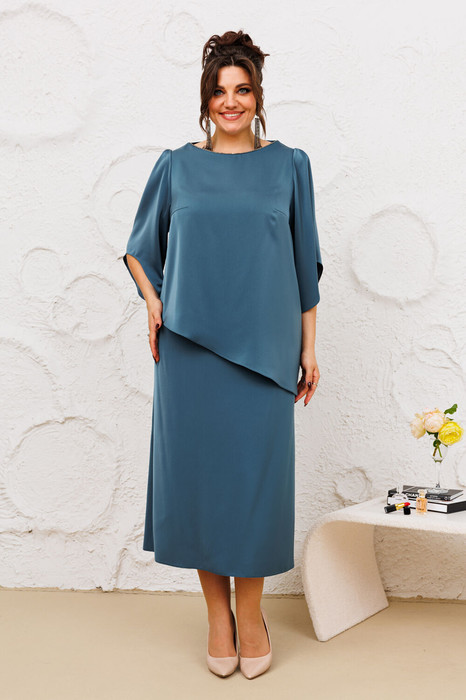 Костюм женский относится к нарядной торжественной одежде. Костюм женский 2-х предметный блузон и юбка. Блузон женский прямого силуэта с фигурным низом. Перед с 2-мя нагрудными вытачками. Спинка цельнокроеная. Горловина обточная, с фигурным вырезом "лодочка" без воротника, по переду горловина декорирована отделочной втачной тесьмой. Рукав втачной, прямой, одно шовный, длиной 3/4 с фигурным низом, окат рукава со встречной складкой. Блузон без плечевых накладок. Юбка женская прямая, длиной до нижней части икры. Переднее полотнище цельнокроеное. Заднее полотнище с 2-м я таллиевыми вытачками. Юбка с притачным поясом, собранным на эластичную тесьму Юбка на подкладке. Длина юбки по боковому срез 87 см. Длина спинки блузона 67 см, длина рукава 34 см.