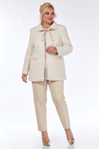 Костюм женский предназначен для повседневной носки. Костюм женский 2-х предметный блузка и юбка-брюки. Блузка женская прямого силуэта, длиной до линии бёдер. Перед с 2-мя нагрудными вытачками. Спинка с отрезной кокеткой, с 1-ной встречной складкой, кокетка декорирована пришивной металлической пластиной. Боковые швы с разрезами. Горловина круглая, обточная, без воротника. Рукав втачной одно шовный, короткий, с приточной отложной манжетой. Блузка без плечевых накладок. Юбка-брюки длинные широкие. Передние половинки с карманами в боковых швах с 2-мя односторонними зафиксированными складками на каждой половинке. Задние без конструктивных особенностей. Пояс притачной, собран на эластичную тесьму, закреплённую 2-мя отделочными строчками. Длина брюк по боковому срезу 90 см. Длина спинки блузона 56 см, длина рукава 22 см.