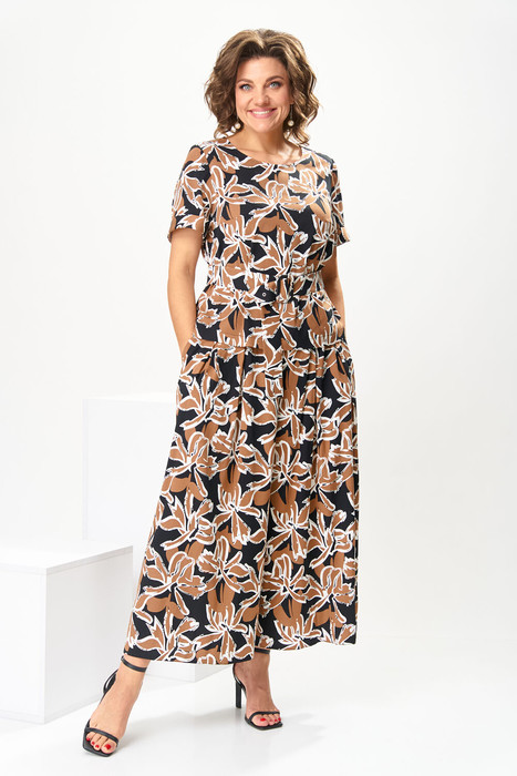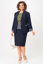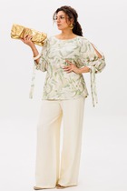Костюм женский предназначен для повседневной носки. Костюм женский 2-х предметный блузка и юбка-брюки. Блузка женская прямого силуэта, длиной до линии бёдер. Перед с 2-мя нагрудными вытачками. Спинка с отрезной кокеткой, с 1-ной встречной складкой, кокетка декорирована пришивной металлической пластиной. Боковые швы с разрезами. Горловина круглая, обточная, без воротника. Рукав втачной одно шовный, короткий, с приточной отложной манжетой. Блузка без плечевых накладок. Юбка-брюки длинные широкие. Передние половинки с карманами в боковых швах с 2-мя односторонними зафиксированными складками на каждой половинке. Задние без конструктивных особенностей. Пояс притачной, собран на эластичную тесьму, закреплённую 2-мя отделочными строчками. Длина брюк по боковому срезу 90 см. Длина спинки блузона 56 см, длина рукава 22 см.